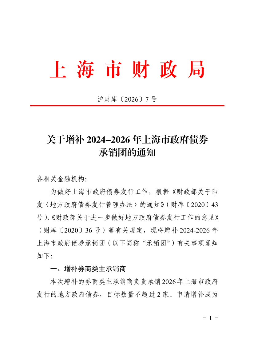为做好上海市政府债券发行工作,根据《财政部关于印发〈地方政府债券发行管理办法〉的通知》(财库〔2020〕43号)、《财政部关于进一步做好地方政府债券发行工作的意见》(财库〔2020〕36号)等有关规定,现将增补2024-2026年上海市政府债券承销团(以下简称“承销团”)有关事项通知如下:
