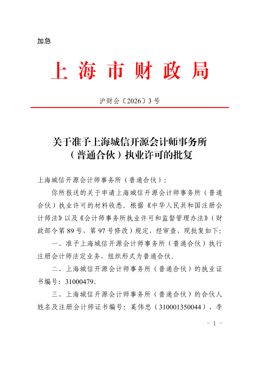 你所报送的关于申请上海城信开源会计师事务所(普通合伙)执业许可的材料收悉。根据《中华人民共和国注册会计师法》以及《会计师事务所执业许可和监督管理办法》(财政部令第89号,第97号修改)规定,经审查,现批复如下: