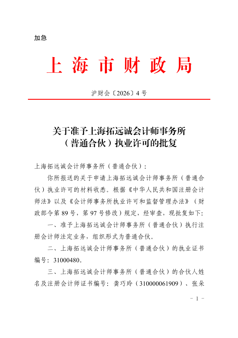 你所报送的关于申请上海拓远诚会计师事务所(普通合伙)执业许可的材料收悉。根据《中华人民共和国注册会计师法》以及《会计师事务所执业许可和监督管理办法》(财政部令第89号,第97号修改)规定,经审查,现批复如下: