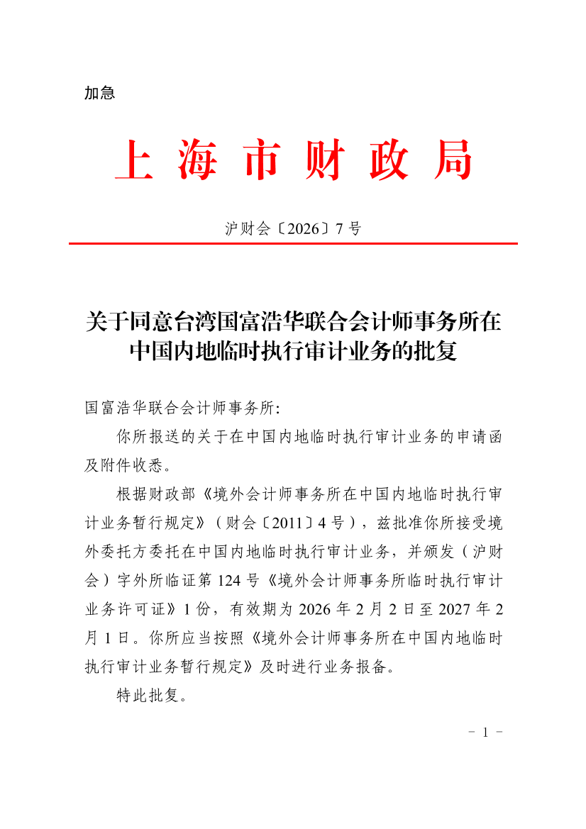 根据财政部《境外会计师事务所在中国内地临时执行审计业务暂行规定》(财会〔2011〕4号),兹批准你所接受境外委托方委托在中国内地临时执行审计业务,并颁发(沪财会)字外所临证第124号《境外会计师事务所临时执行审计业务许可证》1份,有效期为2026年2月2日至2027年2月1日。你所应当按照《境外会计师事务所在中国内地临时执行审计业务暂行规定》及时进行业务报备。