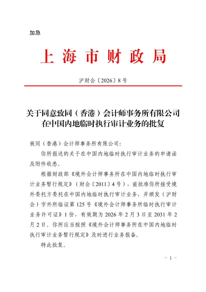 根据财政部《境外会计师事务所在中国内地临时执行审计业务暂行规定》(财会〔2011〕4号),兹批准你所接受境外委托方委托在中国内地临时执行审计业务,并颁发(沪财会)字外所临证第125号《境外会计师事务所临时执行审计业务许可证》1份,有效期为2026年2月3日至2031年2月2日。你所应当按照《境外会计师事务所在中国内地临时执行审计业务暂行规定》及时进行业务报备。