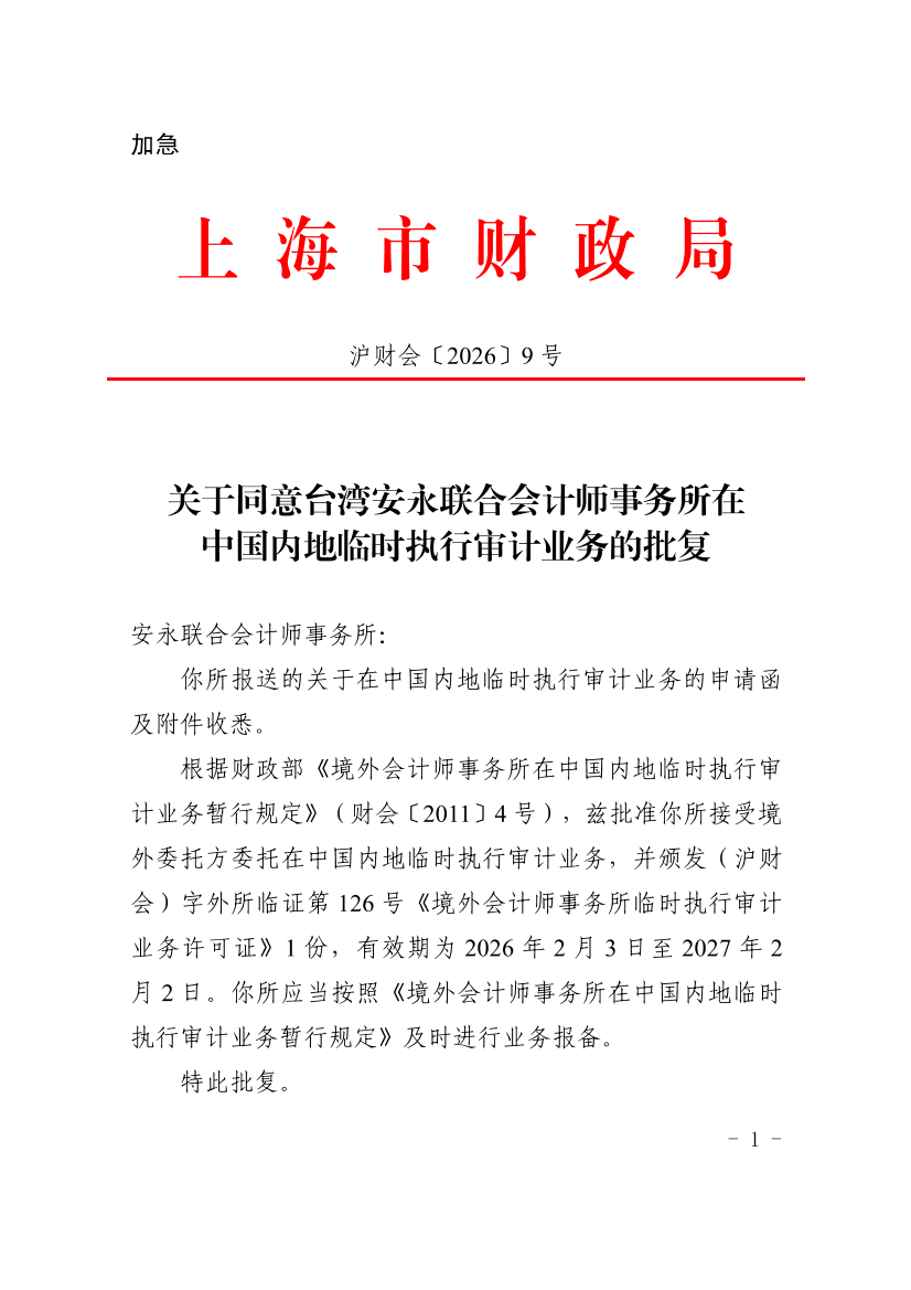 根据财政部《境外会计师事务所在中国内地临时执行审计业务暂行规定》(财会〔2011〕4号),兹批准你所接受境外委托方委托在中国内地临时执行审计业务,并颁发(沪财会)字外所临证第126号《境外会计师事务所临时执行审计业务许可证》1份,有效期为2026年2月3日至2027年2月2日。你所应当按照《境外会计师事务所在中国内地临时执行审计业务暂行规定》及时进行业务报备。