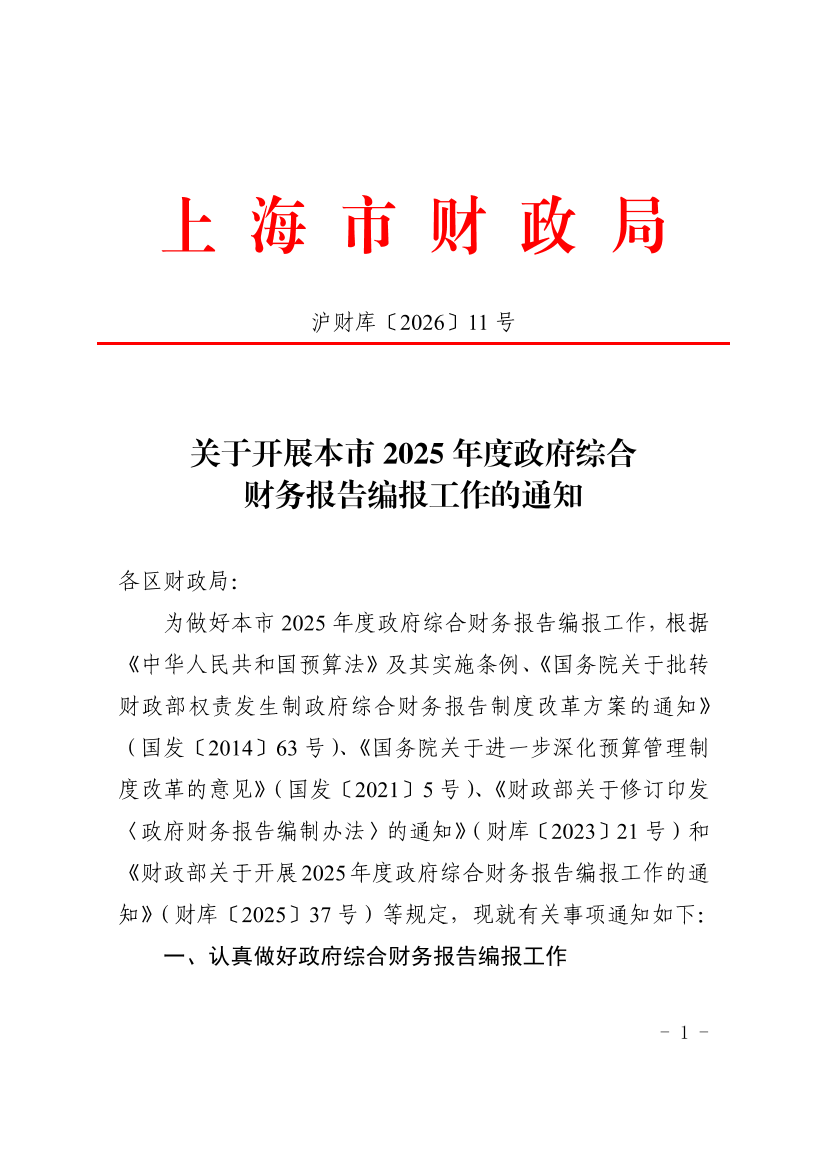 为做好本市2025年度政府综合财务报告编报工作,根据《中华人民共和国预算法》及其实施条例、《国务院关于批转财政部权责发生制政府综合财务报告制度改革方案的通知》(国发〔2014〕63号)、《国务院关于进一步深化预算管理制度改革的意见》(国发〔2021〕5号)、《财政部关于修订印发〈政府财务报告编制办法〉的通知》(财库〔2023〕21号)和《财政部关于开展2025年度政府综合财务报告编报工作的通知》(财库〔2025〕37号)等规定,现就有关事项通知如下:
