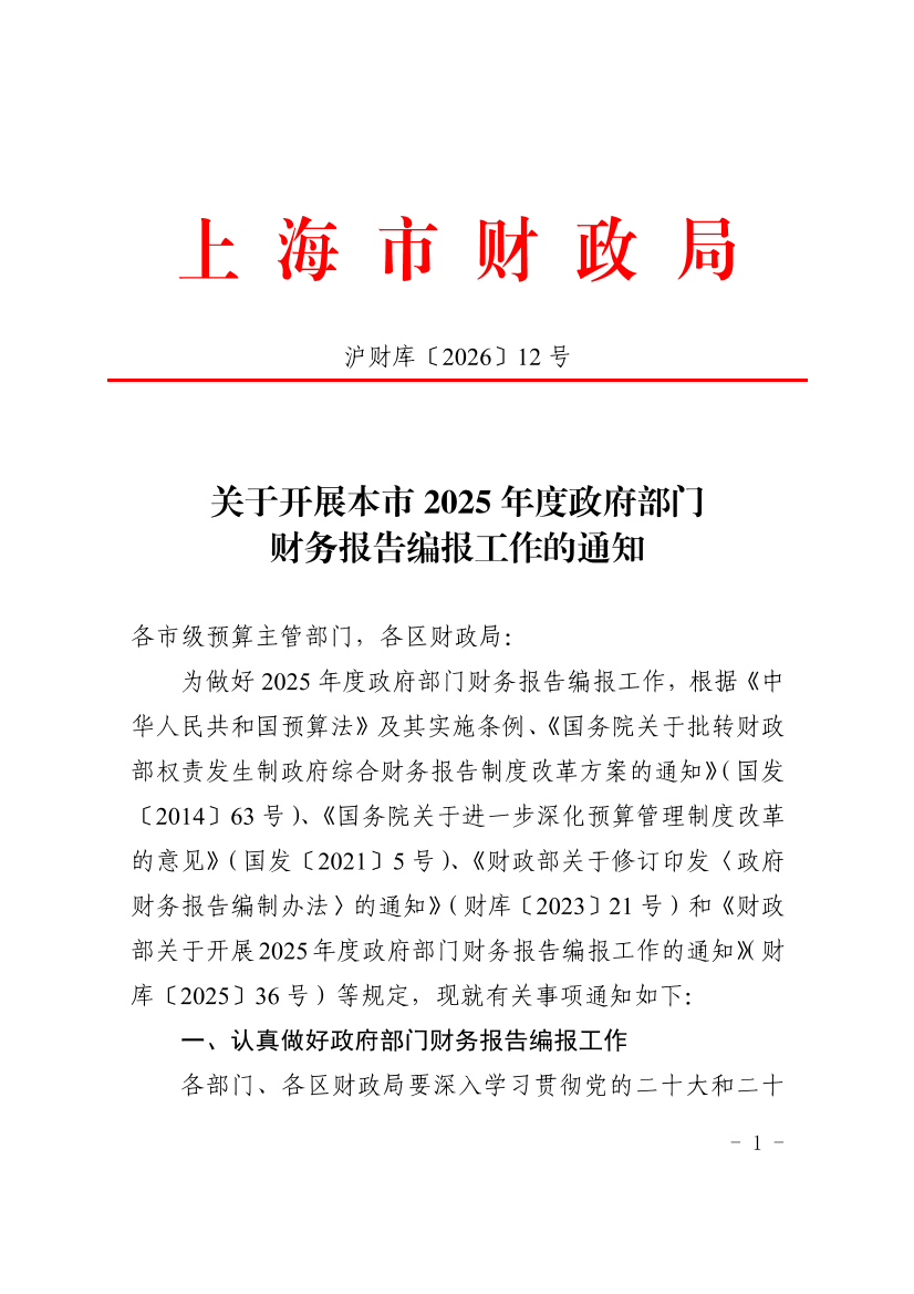 为做好2025年度政府部门财务报告编报工作,根据《中华人民共和国预算法》及其实施条例、《国务院关于批转财政部权责发生制政府综合财务报告制度改革方案的通知》(国发〔2014〕63号)、《国务院关于进一步深化预算管理制度改革的意见》(国发〔2021〕5号)、《财政部关于修订印发〈政府财务报告编制办法〉的通知》(财库〔2023〕21号)和《财政部关于开展2025年度政府部门财务报告编报工作的通知》(财库〔2025〕36号)等规定,现就有关事项通知如下: