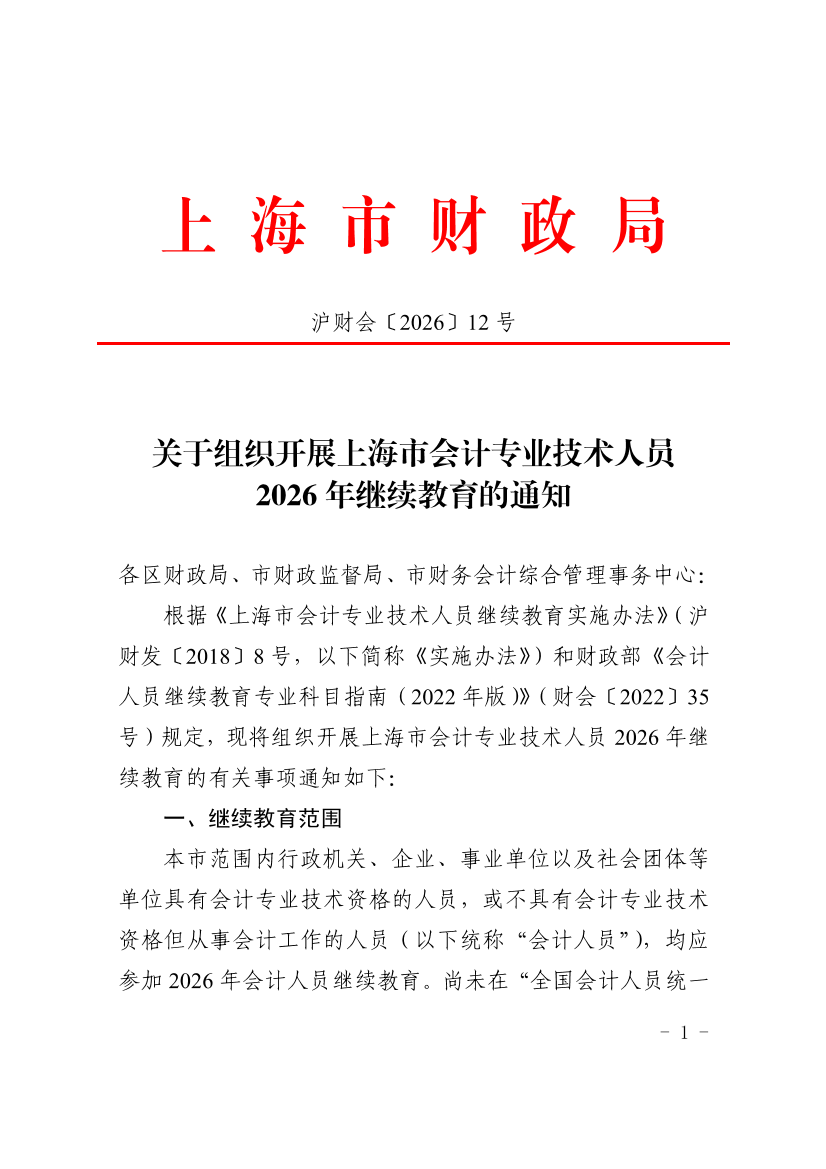 根据《上海市会计专业技术人员继续教育实施办法》(沪财发〔2018〕8号,以下简称《实施办法》)和财政部《会计人员继续教育专业科目指南(2022年版)》(财会〔2022〕35号)规定,现将组织开展上海市会计专业技术人员2026年继续教育的有关事项通知如下: