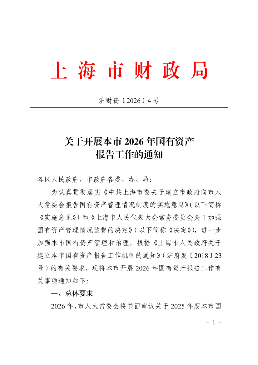 为认真贯彻落实《中共上海市委关于建立市政府向市人大常委会报告国有资产管理情况制度的实施意见》(以下简称《实施意见》)和《上海市人民代表大会常务委员会关于加强国有资产管理情况监督的决定》(以下简称《决定》),进一步加强本市国有资产管理和治理,根据《上海市人民政府关于建立本市国有资产报告工作机制的通知》(沪府发〔2018〕23号)的有关要求,现将本市开展2026年国有资产报告工作有关事项通知如下: