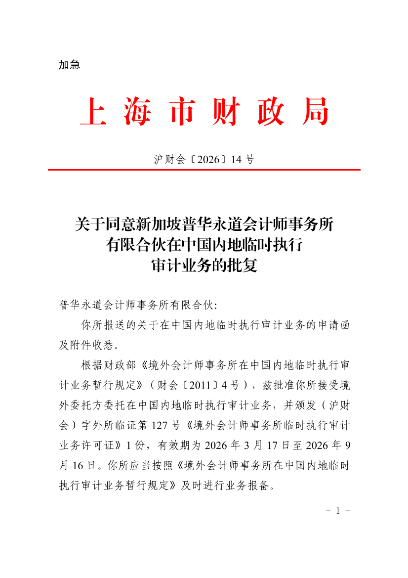 根据财政部《境外会计师事务所在中国内地临时执行审计业务暂行规定》(财会〔2011〕4号),兹批准你所接受境外委托方委托在中国内地临时执行审计业务,并颁发(沪财会)字外所临证第127号《境外会计师事务所临时执行审计业务许可证》1份,有效期为2026年3月17日至2026年9月16日。你所应当按照《境外会计师事务所在中国内地临时执行审计业务暂行规定》及时进行业务报备。