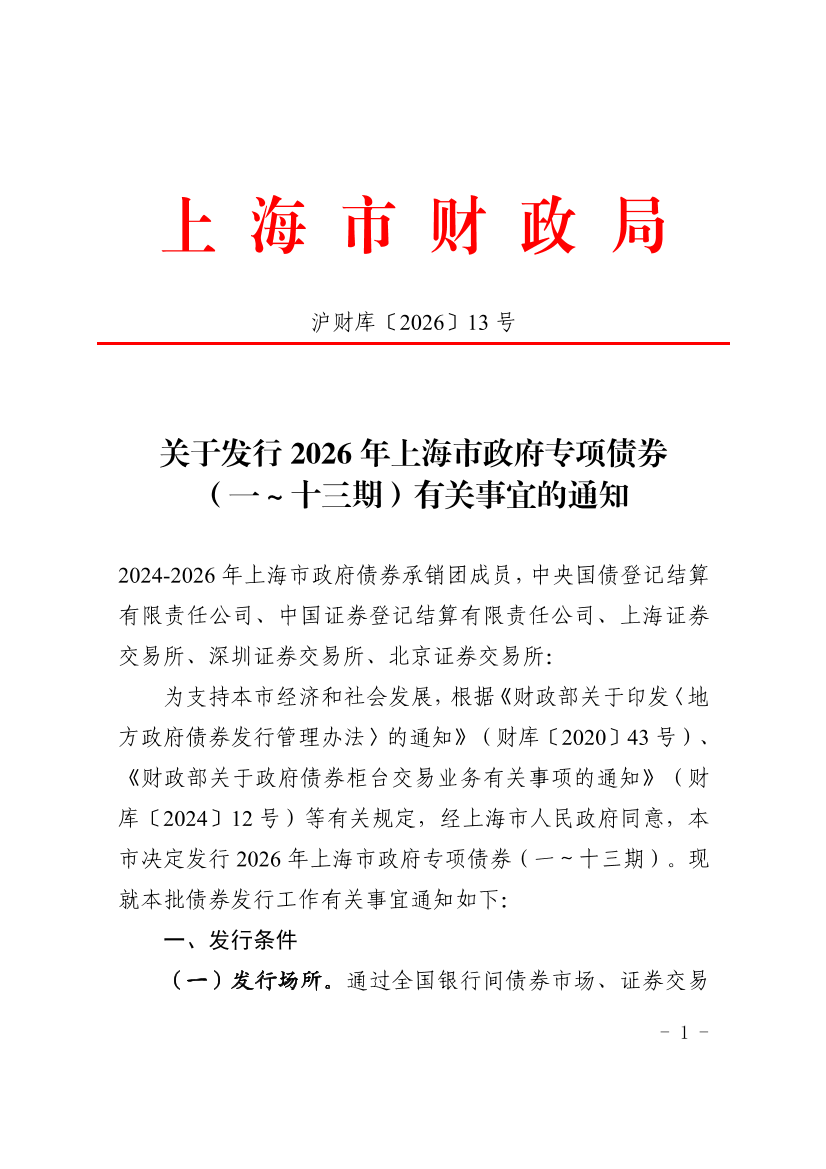 为支持本市经济和社会发展,根据《财政部关于印发〈地方政府债券发行管理办法〉的通知》(财库〔2020〕43号)、《财政部关于政府债券柜台交易业务有关事项的通知》(财库〔2024〕12号)等有关规定,经上海市人民政府同意,本市决定发行2026年上海市政府专项债券(一~十三期)。现就本批债券发行工作有关事宜通知如下: