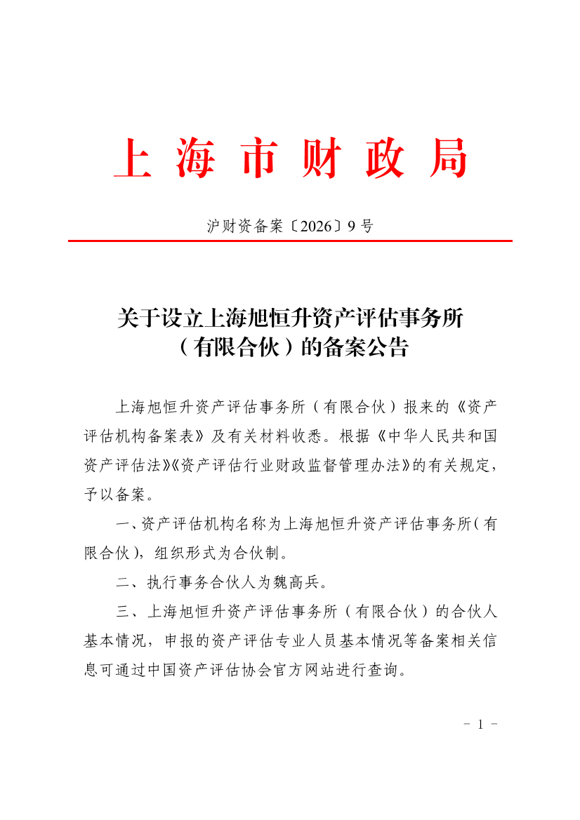 上海旭恒升资产评估事务所(有限合伙)报来的《资产评估机构备案表》及有关材料收悉。根据《中华人民共和国资产评估法》《资产评估行业财政监督管理办法》的有关规定,予以备案。
