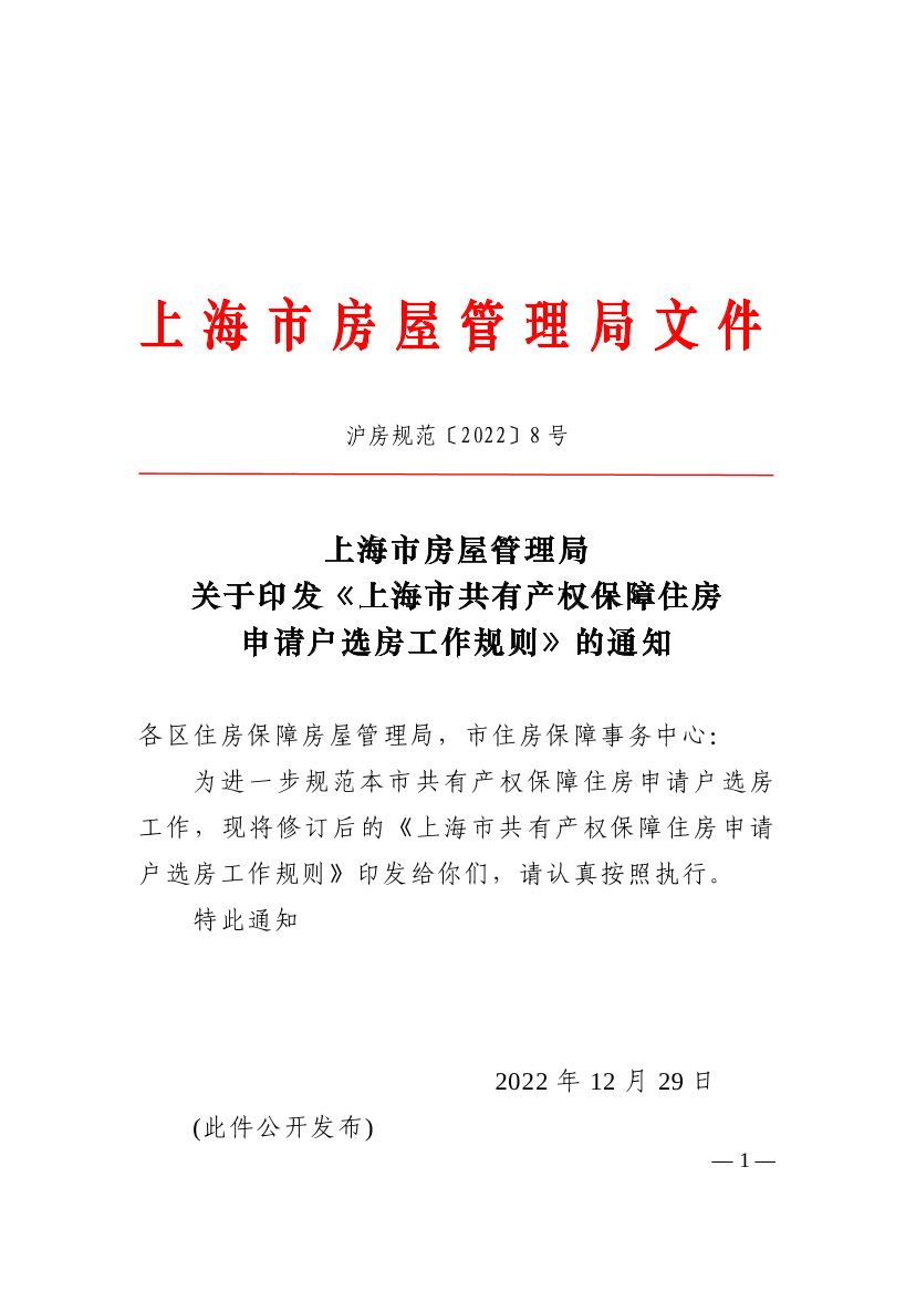 为进一步规范本市共有产权保障住房申请户选房工作,现将修订后的《上海市共有产权保障住房申请户选房工作规则》印发给你们,请认真按照执行。