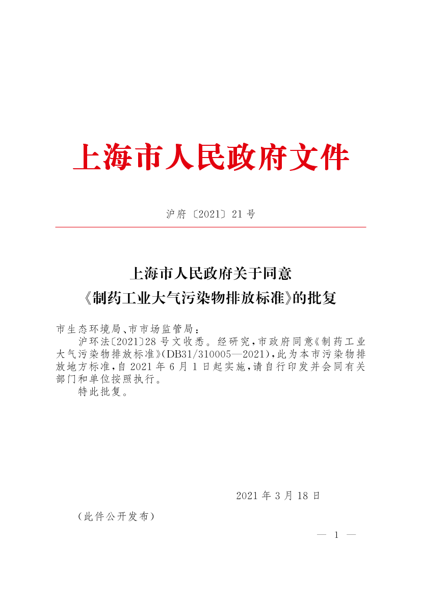 沪环法〔2021〕28号文收悉。经研究,市政府同意《制药工业大气污染物排放标准》(DB31/310005—2021),此为本市污染物排放地方标准,自2021年6月1日起实施,请自行印发并会同有关部门和单位按照执行。
