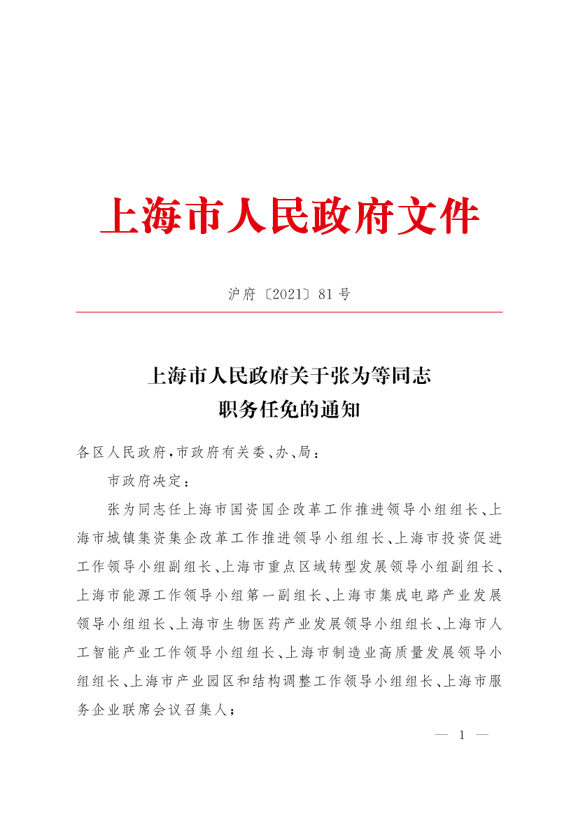 张为同志任上海市国资国企改革工作推进领导小组组长、上海市城镇集资集企改革工作推进领导小组组长、上海市投资促进工作领导小组副组长、上海市重点区域转型发展领导小组副组长、上海市能源工作领导小组第一副组长、上海市集成电路产业发展领导小组组长、上海市生物医药产业发展领导小组组长、上海市人工智能产业工作领导小组组长、上海市制造业高质量发展领导小组组长、上海市产业园区和结构调整工作领导小组组长、上海市服务企业联席会议召集人;