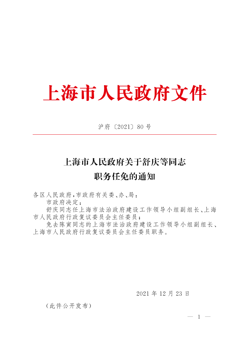 舒庆同志任上海市法治政府建设工作领导小组副组长、上海市人民政府行政复议委员会主任委员;