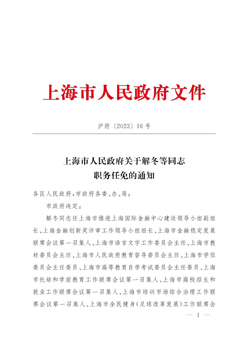 解冬同志任上海市推进上海国际金融中心建设领导小组副组长、上海金融创新奖评审工作领导小组组长、上海市金融稳定发展联席会议第一召集人、上海市语言文字工作委员会主任、上海市教材委员会主任、上海市人民政府教育督导委员会主任、上海市学位委员会主任委员、上海市高等教育自学考试委员会主任委员、上海市托幼和学前教育工作联席会议第一召集人、上海市高校招生和就业工作联席会议第一召集人、上海市培训市场综合治理工作联席会议第一召集人、上海市全民健身(足球改革发展)工作联席会议第一召集人、上海市知识产权联席会议第一召集人。