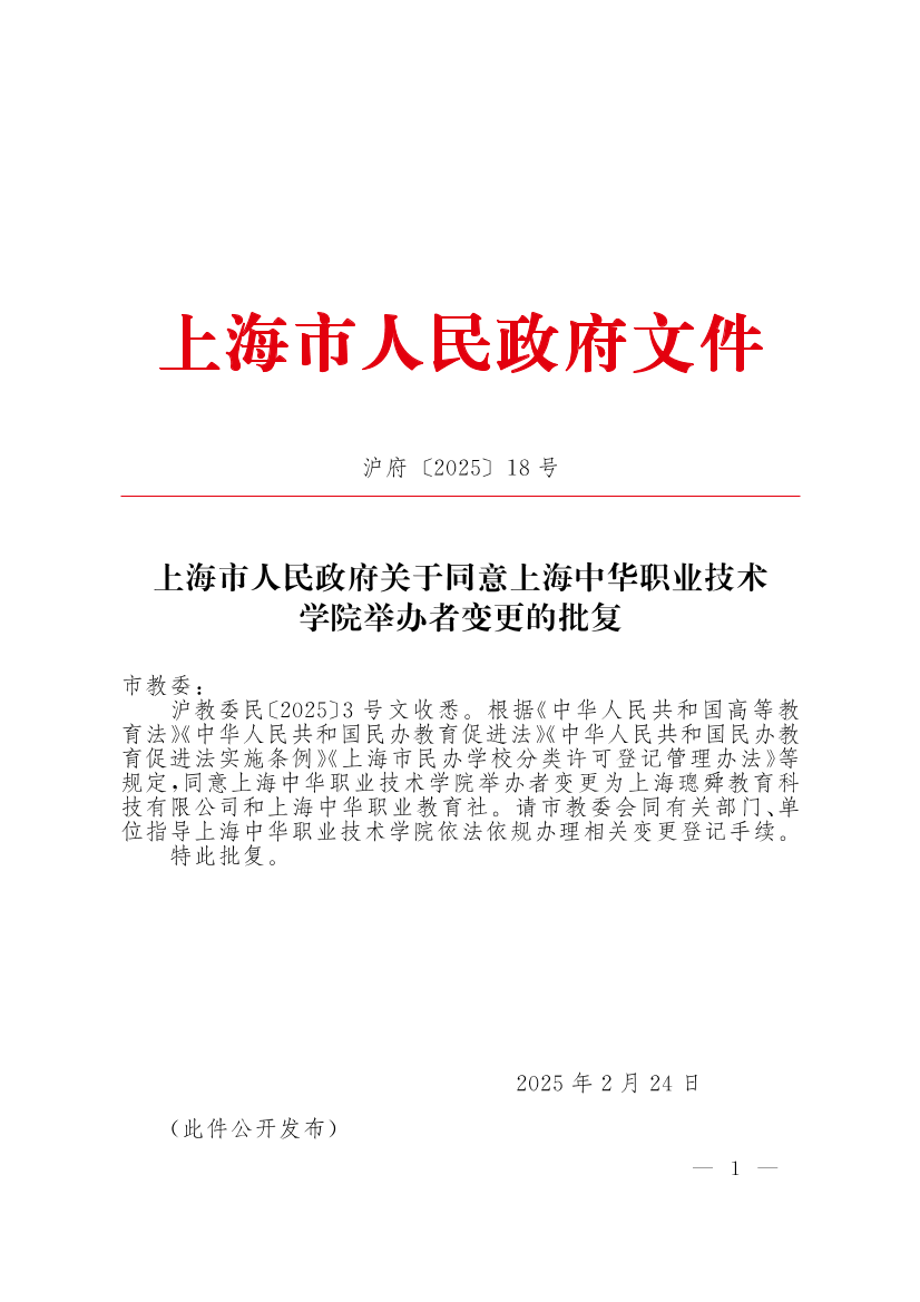 沪教委民〔2025〕3号文收悉。根据《中华人民共和国高等教育法》《中华人民共和国民办教育促进法》《中华人民共和国民办教育促进法实施条例》《上海市民办学校分类许可登记管理办法》等规定,同意上海中华职业技术学院举办者变更为上海璁舜教育科技有限公司和上海中华职业教育社。请市教委会同有关部门、单位指导上海中华职业技术学院依法依规办理相关变更登记手续。