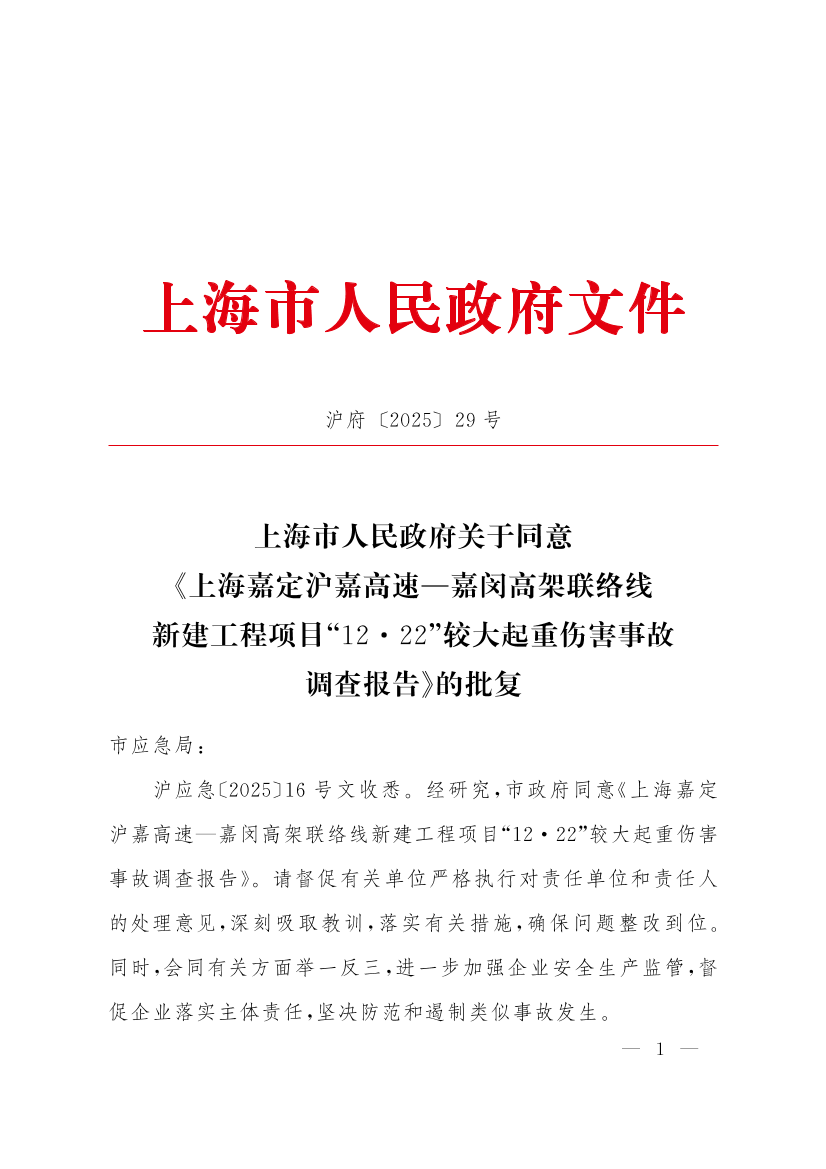 沪应急〔2025〕16号文收悉。经研究,市政府同意《上海嘉定沪嘉高速—嘉闵高架联络线新建工程项目“12·22”较大起重伤害事故调查报告》。请督促有关单位严格执行对责任单位和责任人的处理意见,深刻吸取教训,落实有关措施,确保问题整改到位。同时,会同有关方面举一反三,进一步加强企业安全生产监管,督促企业落实主体责任,坚决防范和遏制类似事故发生。