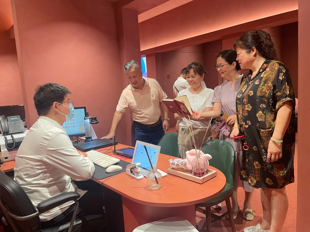 活动现场,工作人员向群众代表介绍了中心日常接待的办事流程、“一网通办”窗口信息化建设、场地环境布置,以及七夕节期间的联名主题活动,并现场沉浸式观看了新人结婚登记和宣誓仪式过程,让代表们“零距离”体验婚姻登记窗口政务服务规范性的同时,更感受到结婚登记的甜蜜温馨和庄严神圣。参观过程中,工作人员还介绍了《民法典》婚姻家庭方面的宣传内容,并对代表们提出的婚姻登记政策问题进行详细解答,增进群众对婚姻家庭法律知识的了解。