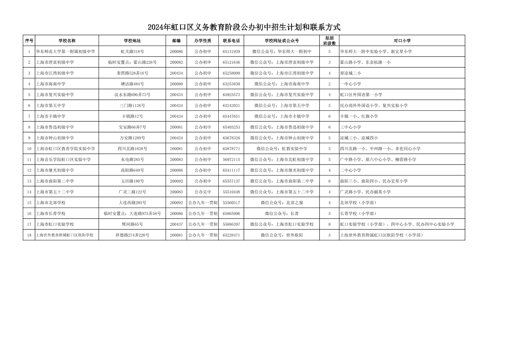 | 2024年虹口区义务教育阶段公办初中招生计划和联系方式 | ||||||||