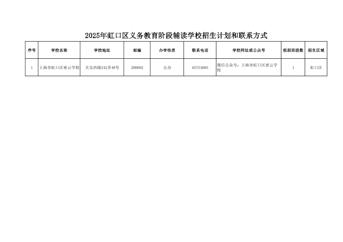 2025年虹口区义务教育阶段辅读学校招生计划和联系方式