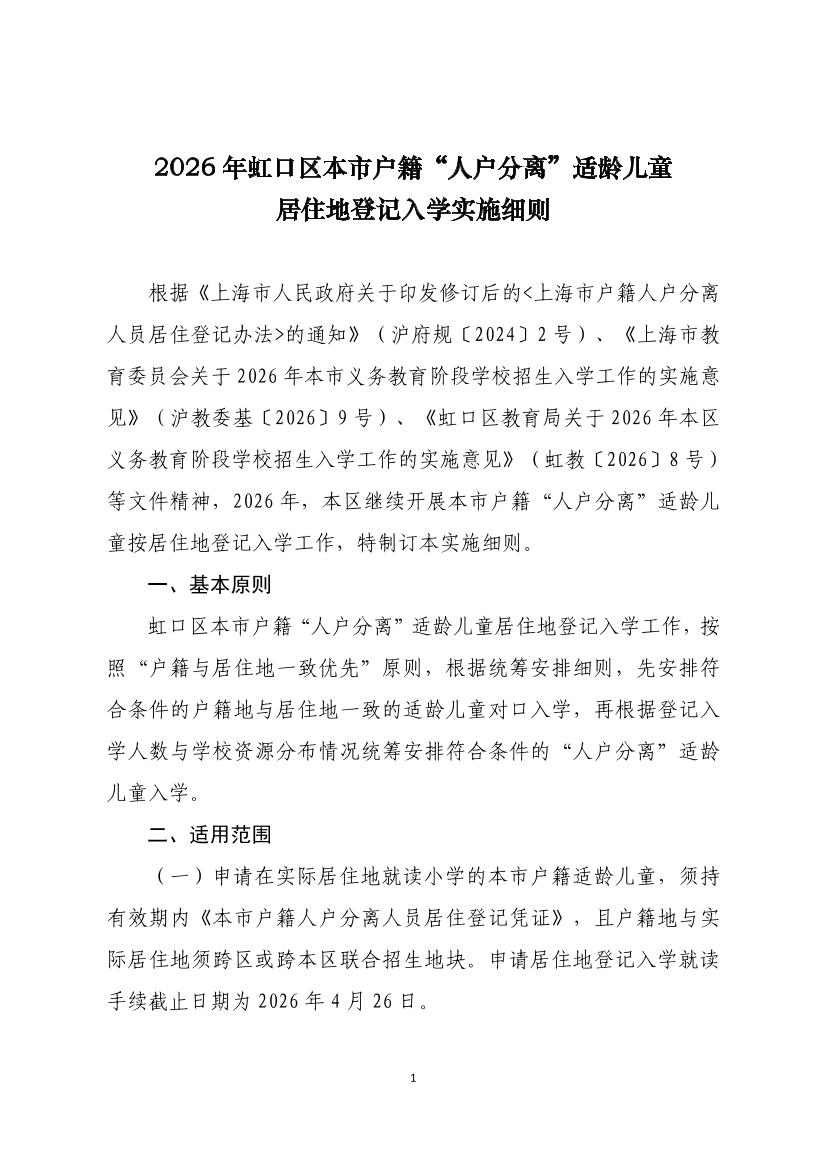 根据《上海市人民政府关于印发修订后的<上海市户籍人户分离人员居住登记办法>的通知》(沪府规〔2024〕2号)、《上海市教育委员会关于2026年本市义务教育阶段学校招生入学工作的实施意见》(沪教委基〔2026〕9号)、《虹口区教育局关于2026年本区义务教育阶段学校招生入学工作的实施意见》(虹教〔2026〕8号)等文件精神,2026年,本区继续开展本市户籍“人户分离”适龄儿童按居住地登记入学工作,特制订本实施细则。