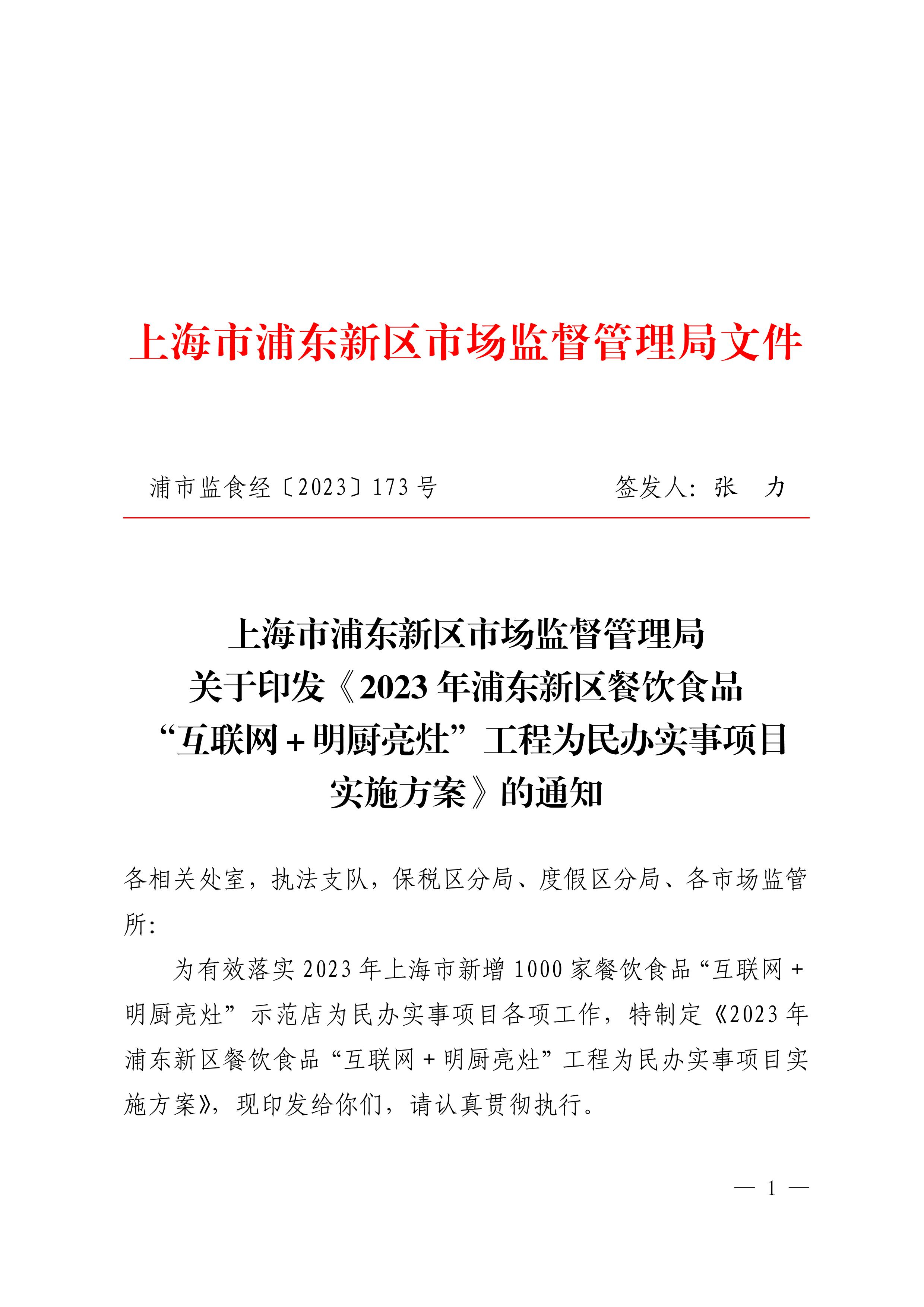 关于印发《2023年浦东新区餐饮食品“互联网+明厨亮灶”工程为民办实事项目实施方案》的通知