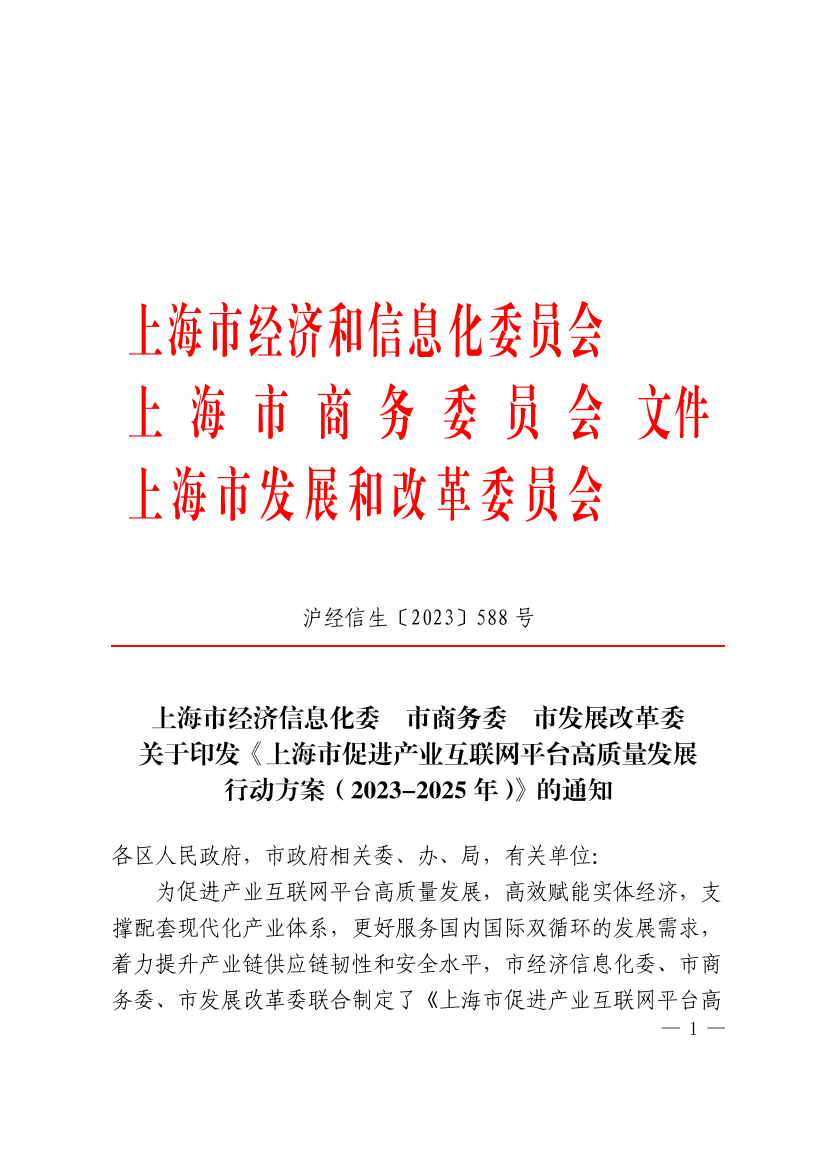 为促进产业互联网平台高质量发展,高效赋能实体经济,支撑配套现代化产业体系,更好服务国内国际双循环的发展需求,着力提升产业链供应链韧性和安全水平,市经济信息化委、市商务委、市发展改革委联合制定了《上海市促进产业互联网平台高质量发展行动方案(2023-2025年)》。经市政府同意,现印发给你们,请认真贯彻执行。
