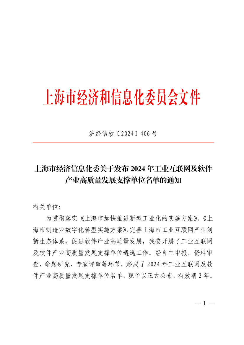 为贯彻落实《上海市加快推进新型工业化的实施方案》、《上海市制造业数字化转型实施方案》,完善上海市工业互联网产业创新生态体系,促进软件产业高质量发展,我委开展了工业互联网及软件产业高质量发展支撑单位遴选工作。经自主申报、资料审查、命题研究、专家评审等环节,形成了2024年工业互联网及软件产业高质量发展支撑单位名单,现予以正式公布,有效期2年。