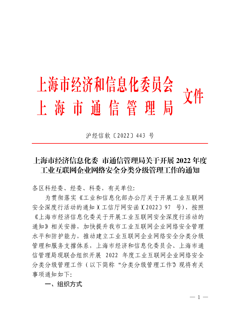 为贯彻落实《工业和信息化部办公厅关于开展工业互联网安全深度行活动的通知)(工信厅网安函)〔2022〕97号),按照《上海市经济信息化委关于开展工业互联网安全深度行活动的通知》相关安排,加快提升我市工业互联网企业网络安全管理水平和防护能力,推动建立工业互联网企业网络安全分类分级管理和服务支撑体系,上海市经济和信息化委员会、上海市通信管理局现联合组织开展2022年度工业互联网企业网络安全分类分级管理工作(以下简称“分类分级管理工作”),现将有关事项通知如下: