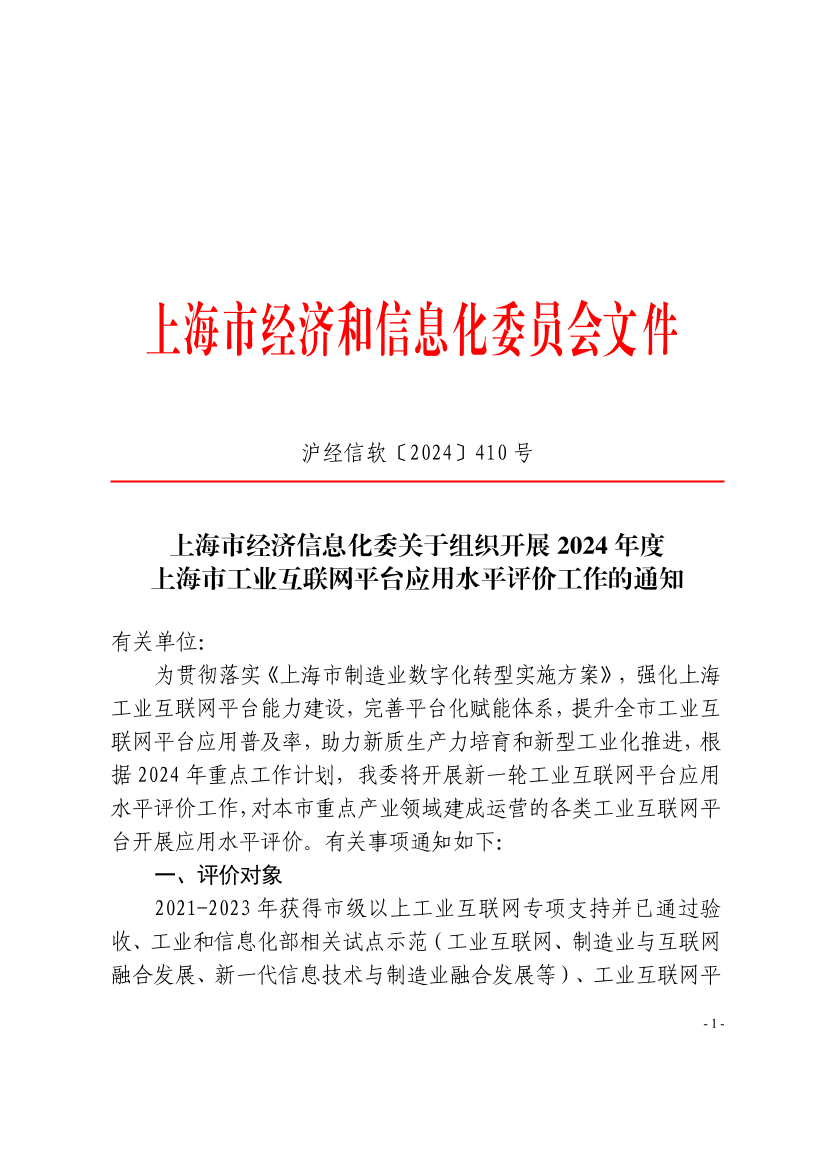 为贯彻落实《上海市制造业数字化转型实施方案》,强化上海工业互联网平台能力建设,完善平台化赋能体系,提升全市工业互联网平台应用普及率,助力新质生产力培育和新型工业化推进,根据2024年重点工作计划,我委将开展新一轮工业互联网平台应用水平评价工作,对本市重点产业领域建成运营的各类工业互联网平台开展应用水平评价。有关事项通知如下: