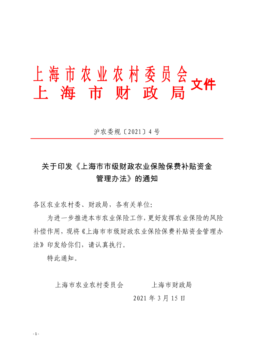 为进一步推进本市农业保险工作,更好发挥农业保险的风险补偿作用,现将《上海市市级财政农业保险保费补贴资金管理办法》印发给你们,请认真执行。