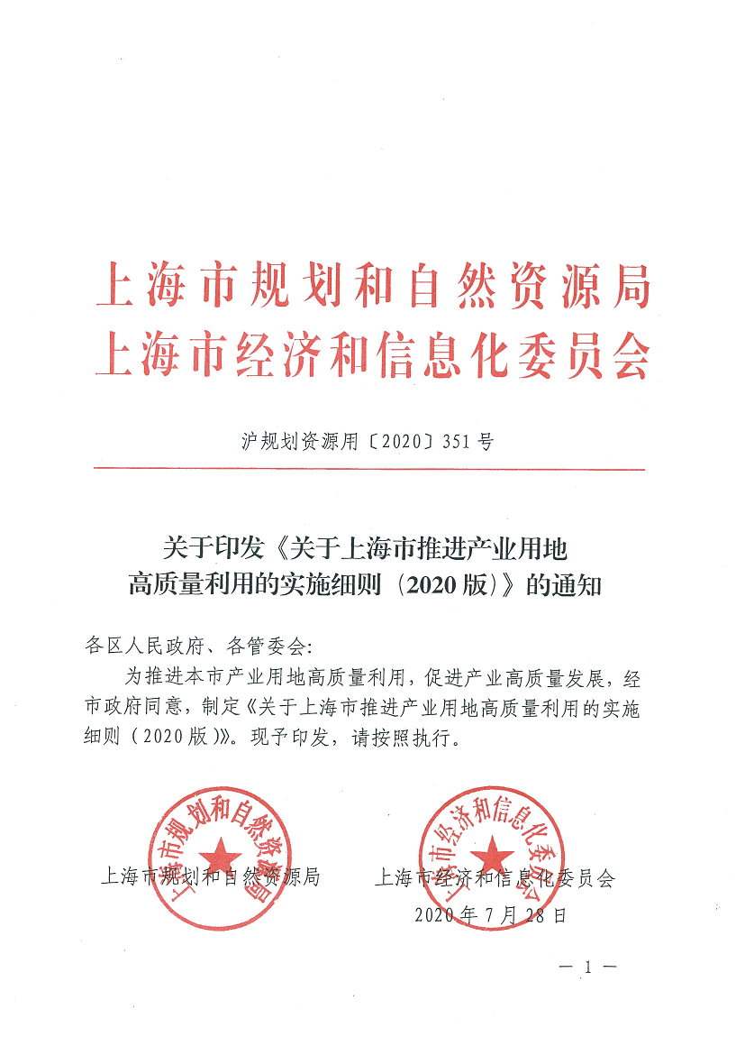 关于印发《关于上海市推进产业用地高质量利用的实施细则(2020版)》的通知