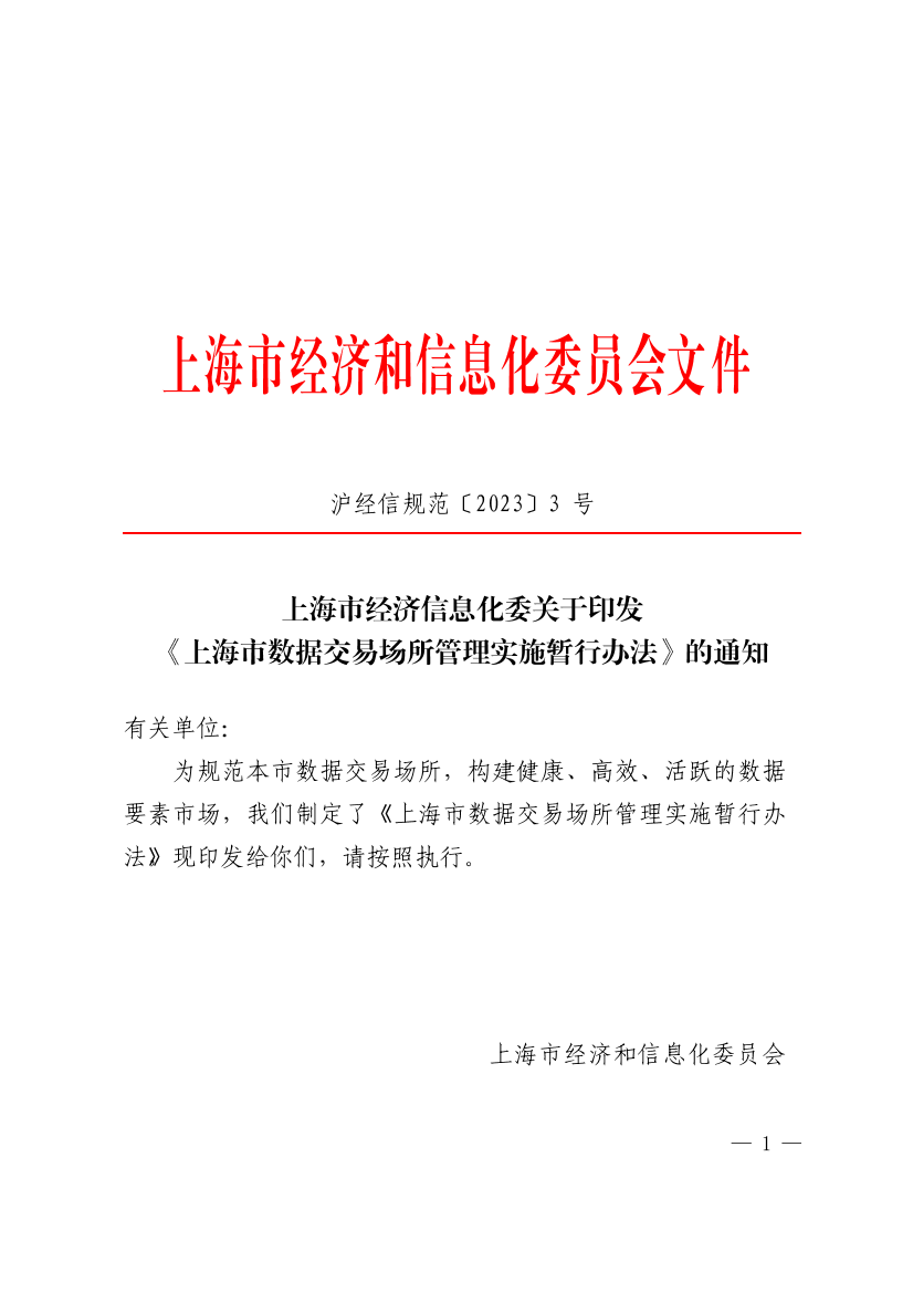为规范本市数据交易场所,构建健康、高效、活跃的数据要素市场,我们制定了《上海市数据交易场所管理实施暂行办法》,现印发给你们,请按照执行。