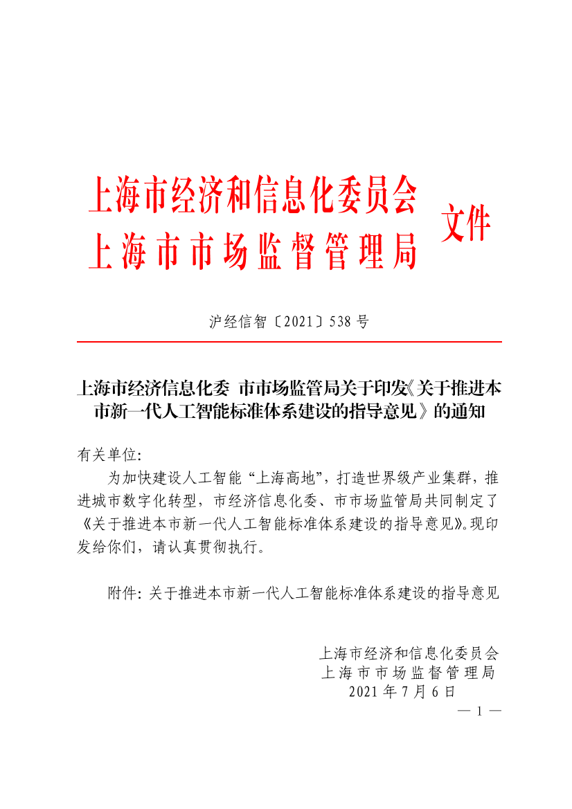 为加快建设人工智能“上海高地”,打造世界级产业集群,推进城市数字化转型,市经济信息化委、市市场监管局共同制定了《关于推进本市新一代人工智能标准体系建设的指导意见》。现印发给你们,请认真贯彻执行。
