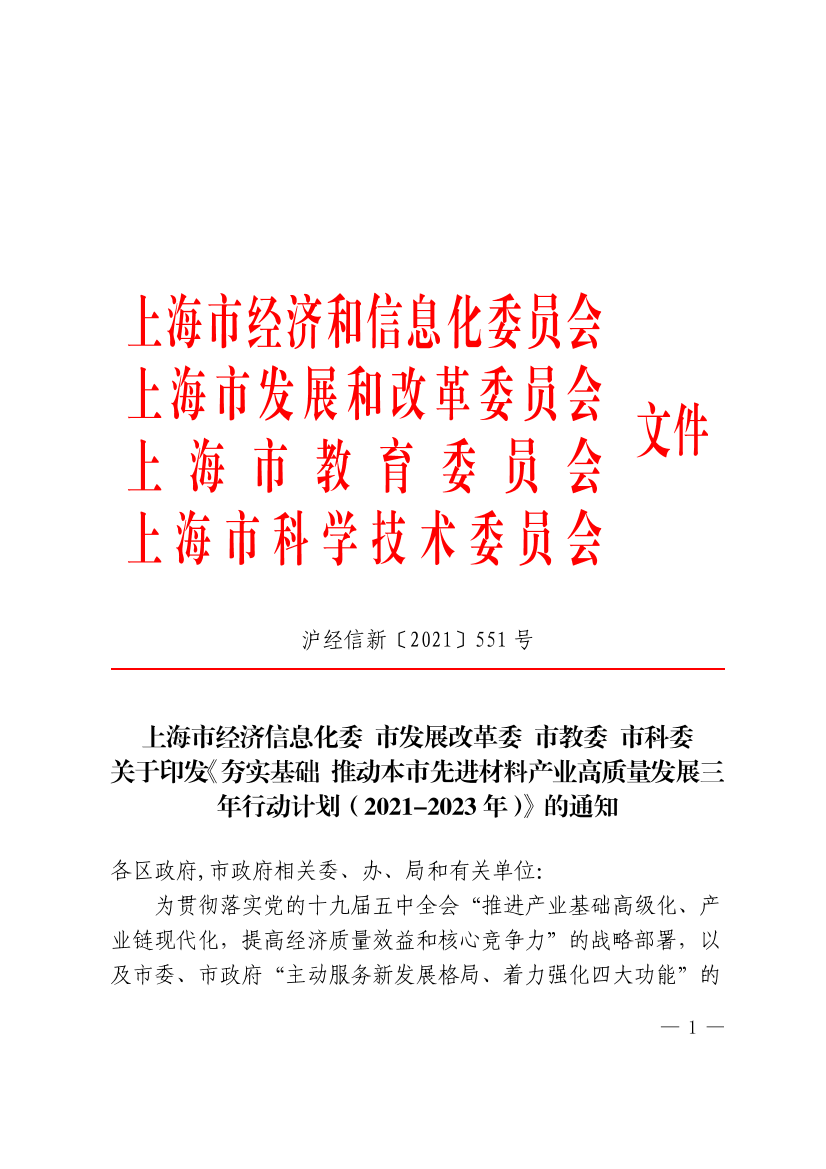 为贯彻落实党的十九届五中全会“推进产业基础高级化、产业链现代化,提高经济质量效益和核心竞争力”的战略部署,以及市委、市政府“主动服务新发展格局、着力强化四大功能”的总体要求,进一步推动本市先进材料产业创新发展,强化对先进制造业高质量发展的支撑保障作用,市经济信息化委、市发展改革委、市教委、市科委联合制定《夯实基础 推动本市先进材料产业高质量发展三年行动计划(2021-2023年)》。经市政府同意,现印发你们,请结合实际认真贯彻实施。