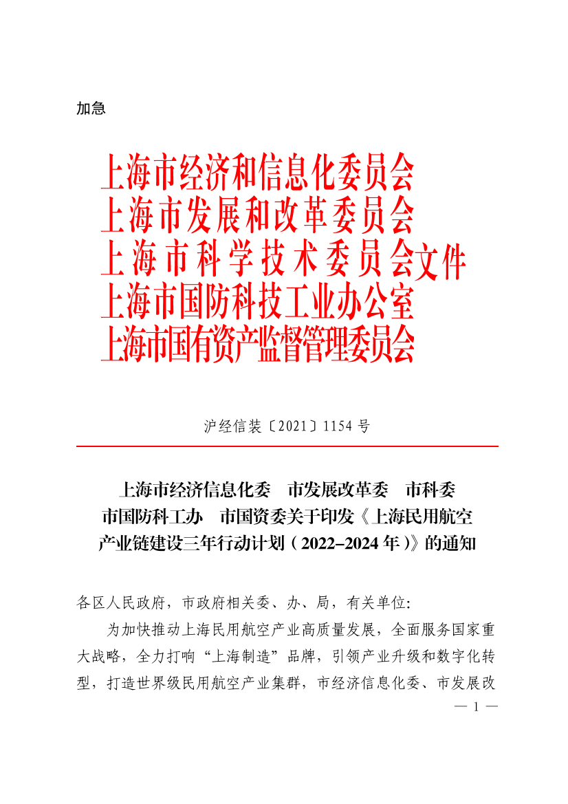 为加快推动上海民用航空产业高质量发展,全面服务国家重大战略,全力打响“上海制造”品牌,引领产业升级和数字化转型,打造世界级民用航空产业集群,市经济信息化委、市发展改革委、市科委、市国防科工办、市国资委联合制定了《上海民用航空产业链建设三年行动计划(2022-2024年)》。经市政府同意,现印发给你们,请认真贯彻执行。