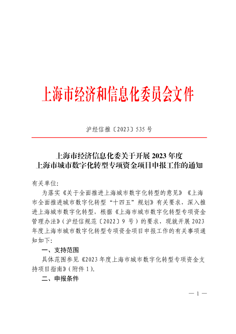 为落实《关于全面推进上海城市数字化转型的意见》《上海市全面推进城市数字化转型“十四五”规划》有关要求,深入推进上海城市数字化转型,根据《上海市城市数字化转型专项资金管理办法》(沪经信规范〔2022〕9 号)的要求,现就开展2023年度上海市城市数字化转型专项资金项目申报工作的有关事项通知如下: