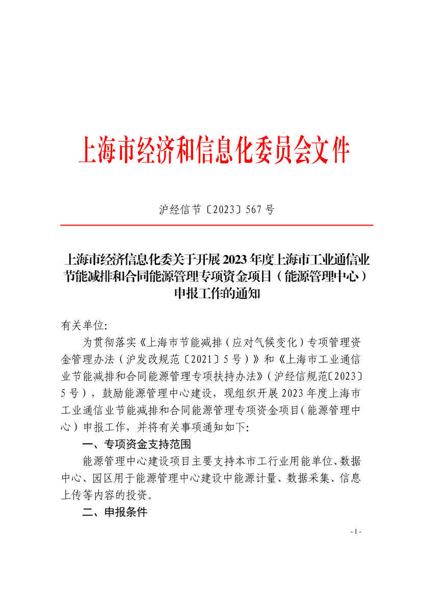 为贯彻落实《上海市节能减排(应对气候变化)专项管理资金管理办法(沪发改规范〔2021〕5号)》和《上海市工业通信业节能减排和合同能源管理专项扶持办法》(沪经信规范〔2023〕5号),鼓励能源管理中心建设,现组织开展2023年度上海市工业通信业节能减排和合同能源管理专项资金项目(能源管理中心)申报工作,并将有关事项通知如下: