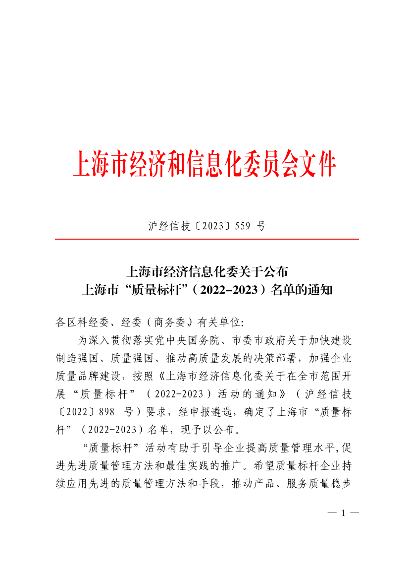 为深入贯彻落实党中央国务院、市委市政府关于加快建设制造强国、质量强国、推动高质量发展的决策部署,加强企业质量品牌建设,按照《上海市经济信息化委关于在全市范围开展“质量标杆”(2022-2023)活动的通知》(沪经信技〔2022〕898号)要求,经申报遴选,确定了上海市“质量标杆”(2022-2023)名单,现予以公布。