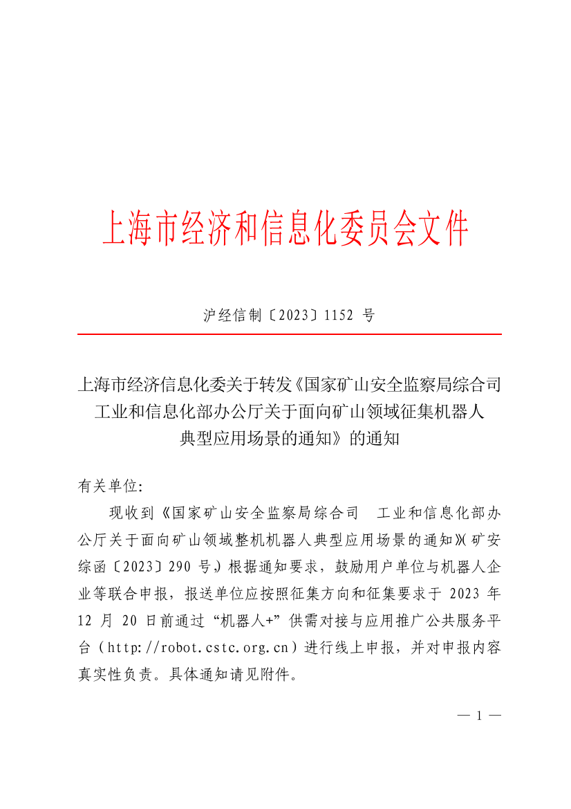 现收到《国家矿山安全监察局综合司 工业和信息化部办公厅关于面向矿山领域整机机器人典型应用场景的通知》(矿安综函〔2023〕290号),根据通知要求,鼓励用户单位与机器人企业等联合申报,报送单位应按照征集方向和征集要求于2023年12月20日前通过“机器人+”供需对接与应用推广公共服务平台(http://robot.cstc.org.cn)进行线上申报,并对申报内容真实性负责。具体通知请见附件。