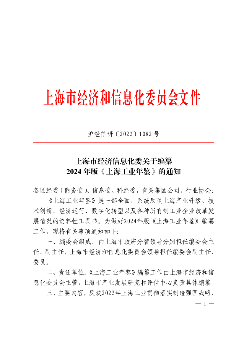《上海工业年鉴》是一部全面、系统反映上海产业升级、技术创新、经济运行、数字化转型以及各种所有制工业企业改革发展情况的资料性工具书。为做好2024年版《上海工业年鉴》编纂工作,现将有关事项通知如下: