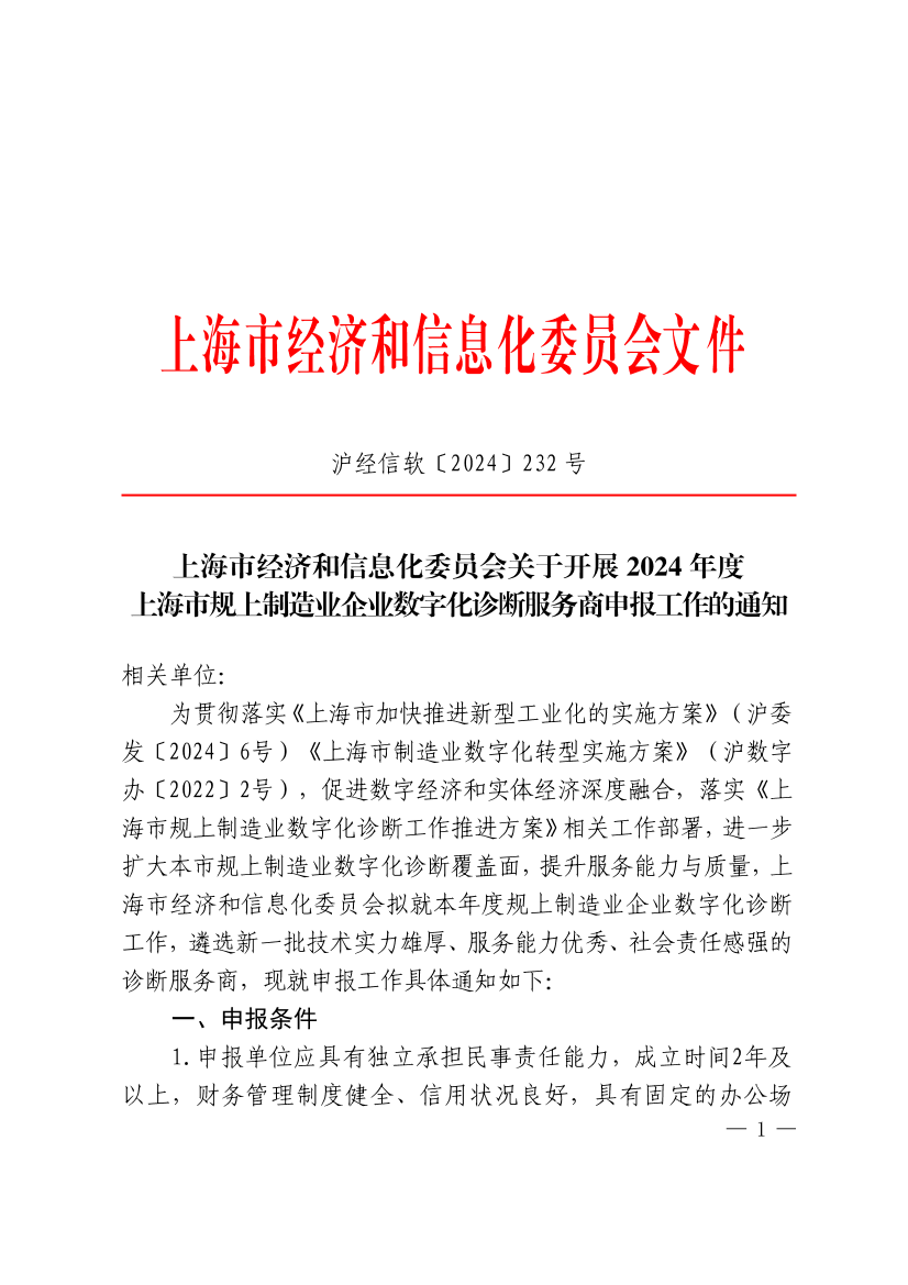 为贯彻落实《上海市加快推进新型工业化的实施方案》(沪委发〔2024〕6号)《上海市制造业数字化转型实施方案》(沪数字办〔2022〕2号),促进数字经济和实体经济深度融合,落实《上海市规上制造业数字化诊断工作推进方案》相关工作部署,进一步扩大本市规上制造业数字化诊断覆盖面,提升服务能力与质量,上海市经济和信息化委员会拟就本年度规上制造业企业数字化诊断工作,遴选新一批技术实力雄厚、服务能力优秀、社会责任感强的诊断服务商,现就申报工作具体通知如下: