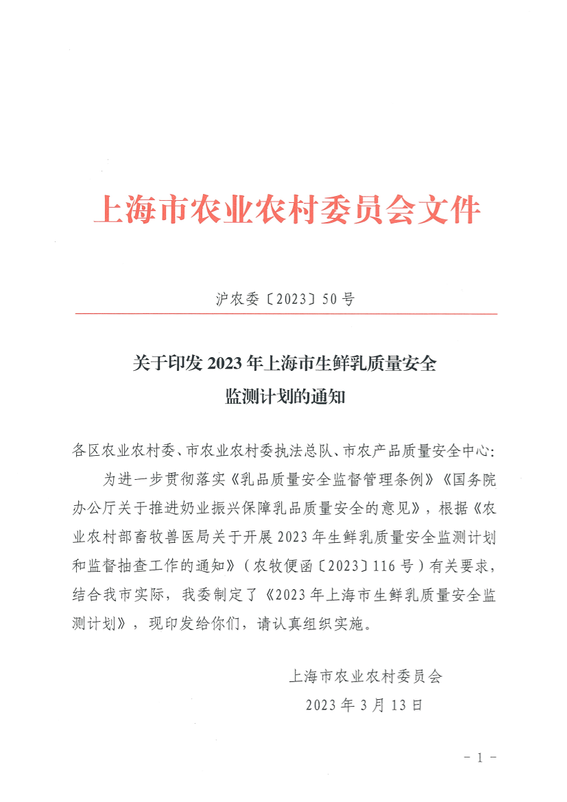 为进一步贯彻落实《乳品质量安全监督管理条例》《国务院办公厅关于推进奶业振兴保障乳品质量安全的意见》,根据《农业农村部畜牧兽医局关于开展2023年生鲜乳质量安全监测计划和监督抽查工作的通知》(农牧便函〔2023〕116号)有关要求,结合我市实际,我委制定了《2023年上海市生鲜乳质量安全监测计划》,现印发给你们,请认真组织实施。