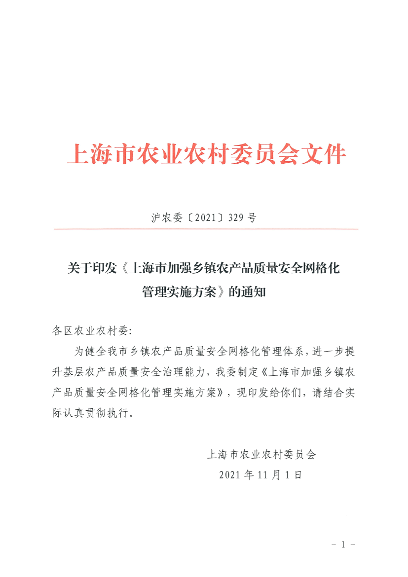 为健全我市乡镇农产品质量安全网格化管理体系,进一步提升基层农产品质量安全治理能力,我委制定《上海市加强乡镇农产品质量安全网格化管理实施方案》,现印发给你们,请结合实际认真贯彻执行。
