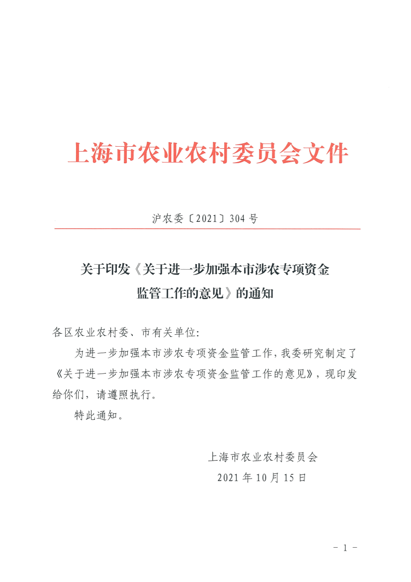 为进一步加强本市涉农专项资金监管工作,我委研究制定了《关于进一步加强本市涉农专项资金监管工作的意见》,现印发给你们,请遵照执行。