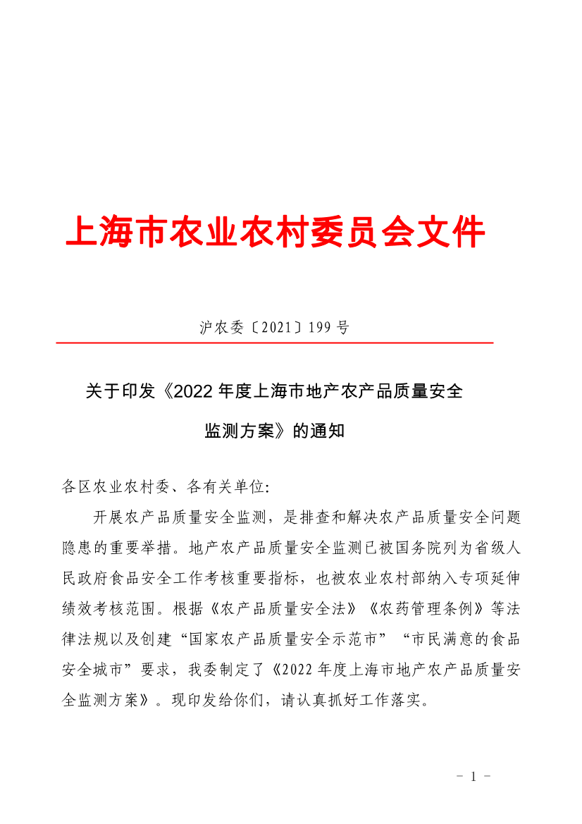 开展农产品质量安全监测,是排查和解决农产品质量安全问题隐患的重要举措。地产农产品质量安全监测已被国务院列为省级人民政府食品安全工作考核重要指标,也被农业农村部纳入专项延伸绩效考核范围。根据《农产品质量安全法》《农药管理条例》等法律法规以及创建“国家农产品质量安全示范市”“市民满意的食品安全城市”要求,我委制定了《2022年度上海市地产农产品质量安全监测方案》。现印发给你们,请认真抓好工作落实。