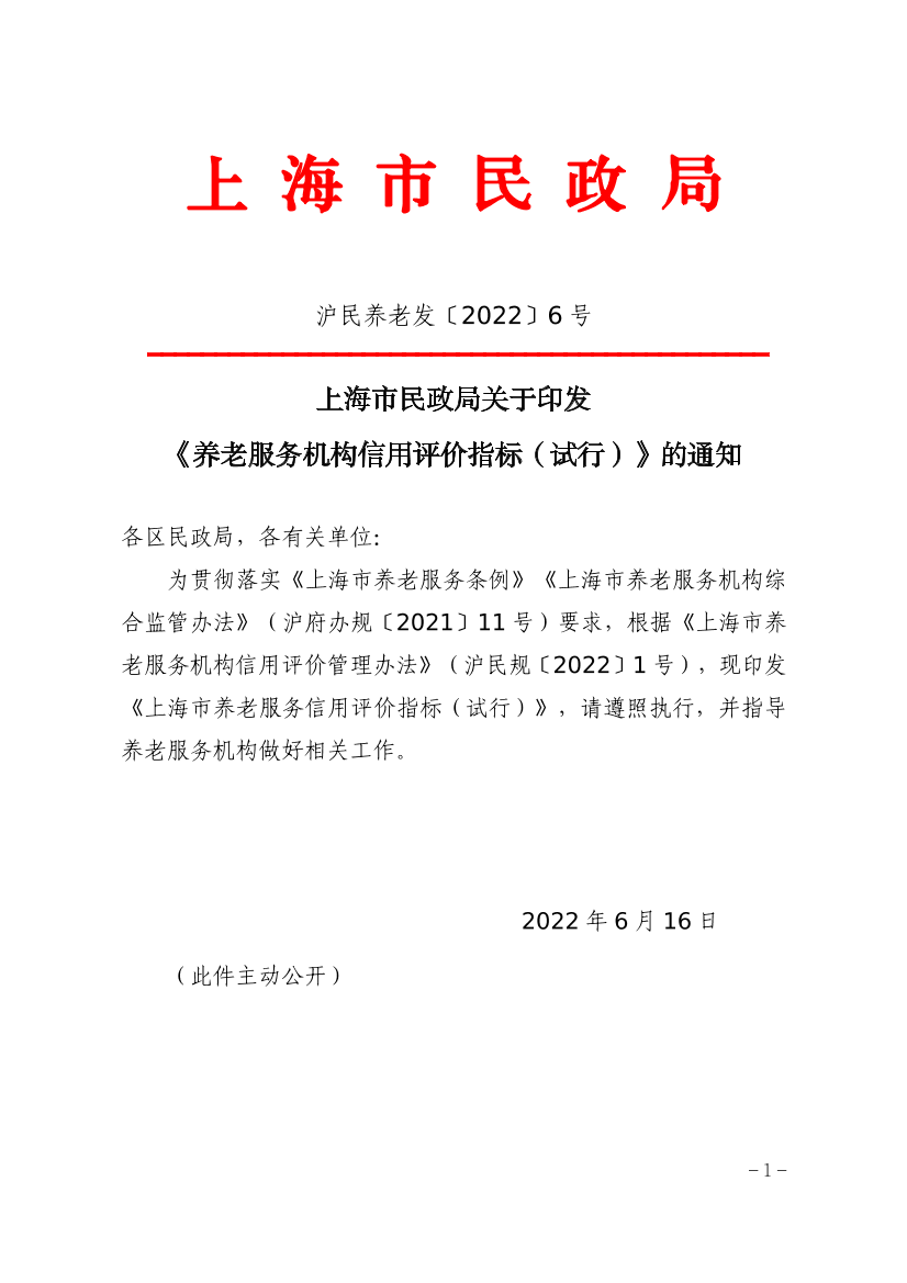 为贯彻落实《上海市养老服务条例》《上海市养老服务机构综合监管办法》(沪府办规〔2021〕11号)要求,根据《上海市养老服务机构信用评价管理办法》(沪民规〔2022〕1号),现印发《上海市养老服务信用评价指标(试行)》,请遵照执行,并指导养老服务机构做好相关工作。