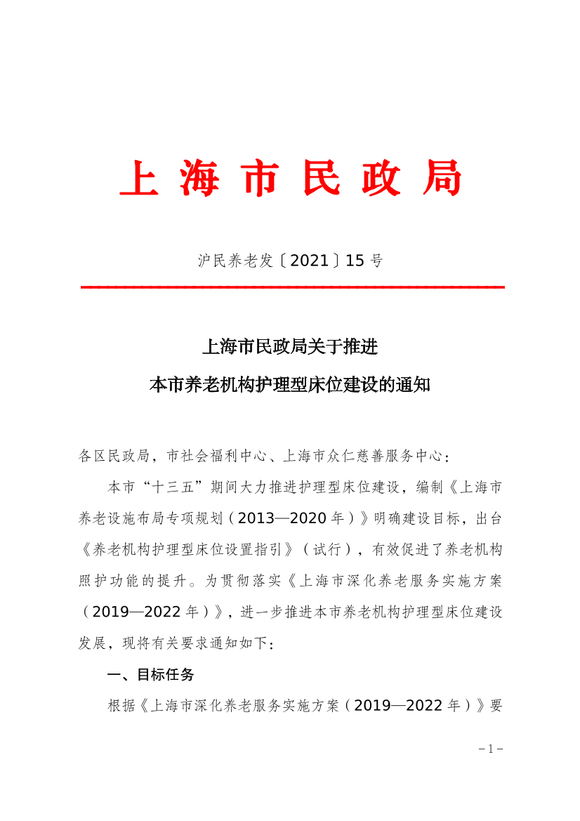 本市“十三五”期间大力推进护理型床位建设,编制《上海市养老设施布局专项规划(2013—2020年)》明确建设目标,出台《养老机构护理型床位设置指引》(试行),有效促进了养老机构照护功能的提升。为贯彻落实《上海市深化养老服务实施方案(2019—2022年)》,进一步推进本市养老机构护理型床位建设发展,现将有关要求通知如下: