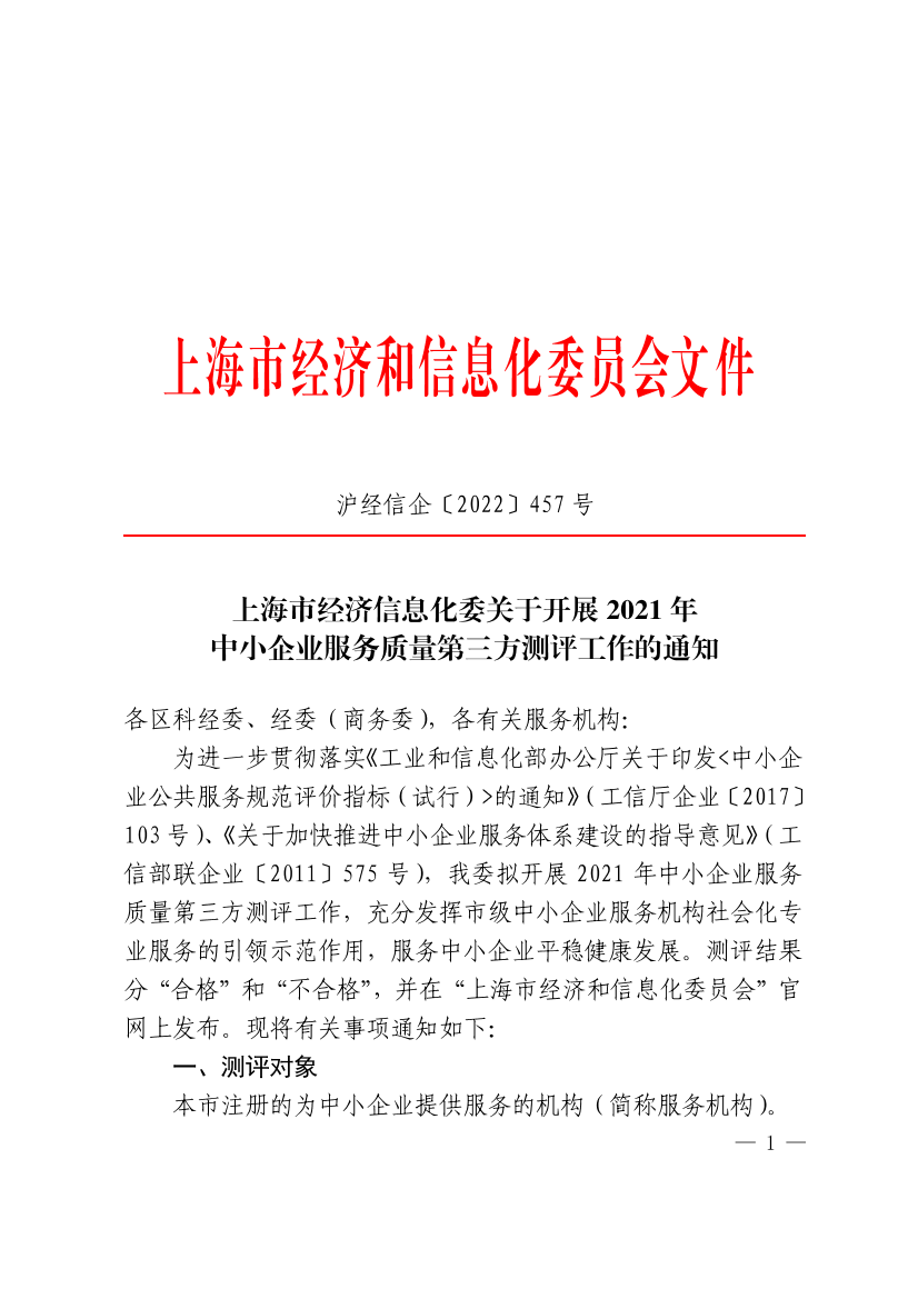 (三)我委委托上海市经济和信息化发展研究中心对各区推荐上报的服务机构统一进行服务质量第三方测评工作,根据测评结果确定2021年度上海市中小企业服务机构名单。