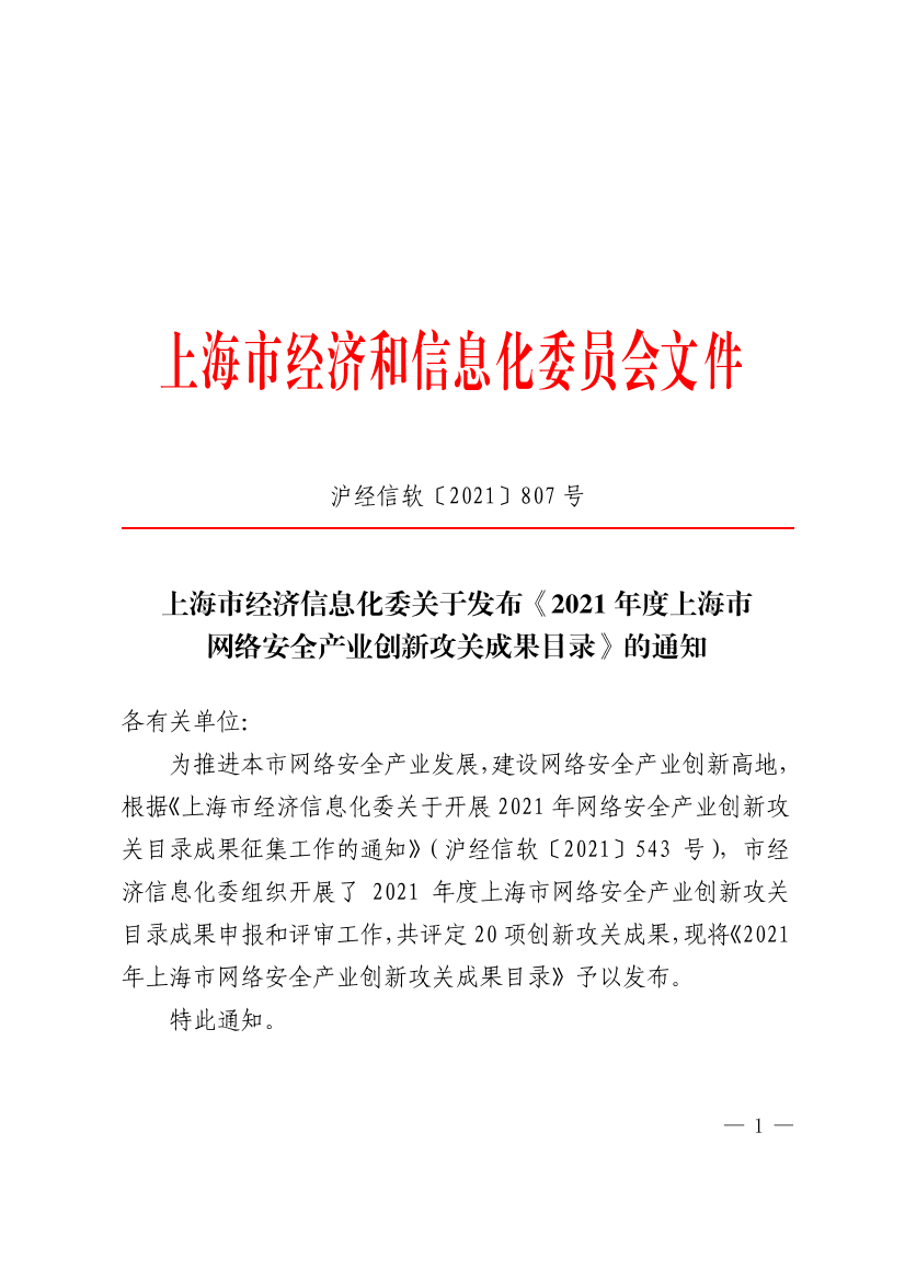 为推进本市网络安全产业发展,建设网络安全产业创新高地,根据《上海市经济信息化委关于开展2021年网络安全产业创新攻关目录成果征集工作的通知》(沪经信软〔2021〕543号),市经济信息化委组织开展了2021年度上海市网络安全产业创新攻关目录成果申报和评审工作,共评定20项创新攻关成果,现将《2021年上海市网络安全产业创新攻关成果目录》予以发布。