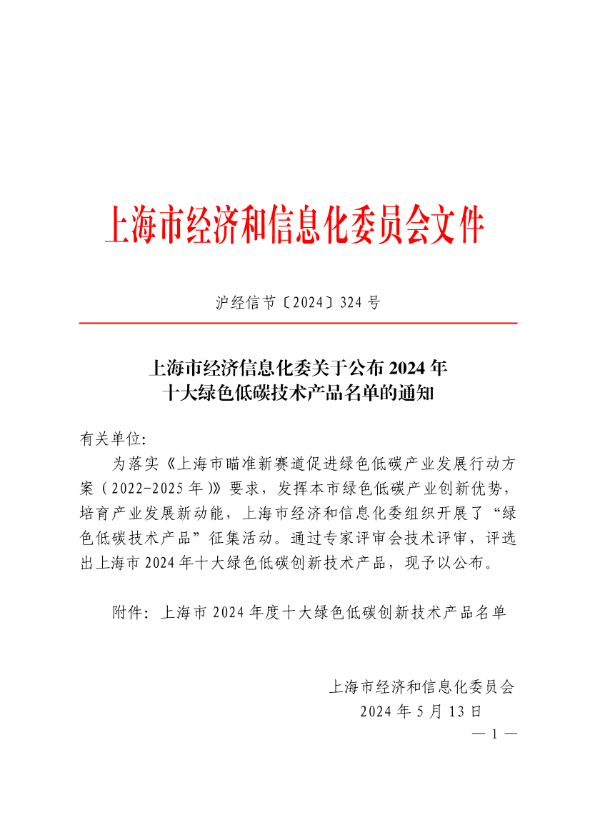 为落实《上海市瞄准新赛道促进绿色低碳产业发展行动方案(2022-2025年)》要求,发挥本市绿色低碳产业创新优势,培育产业发展新动能,上海市经济和信息化委组织开展了“绿色低碳技术产品”征集活动。通过专家评审会技术评审,评选出上海市2024年十大绿色低碳创新技术产品,现予以公布。
